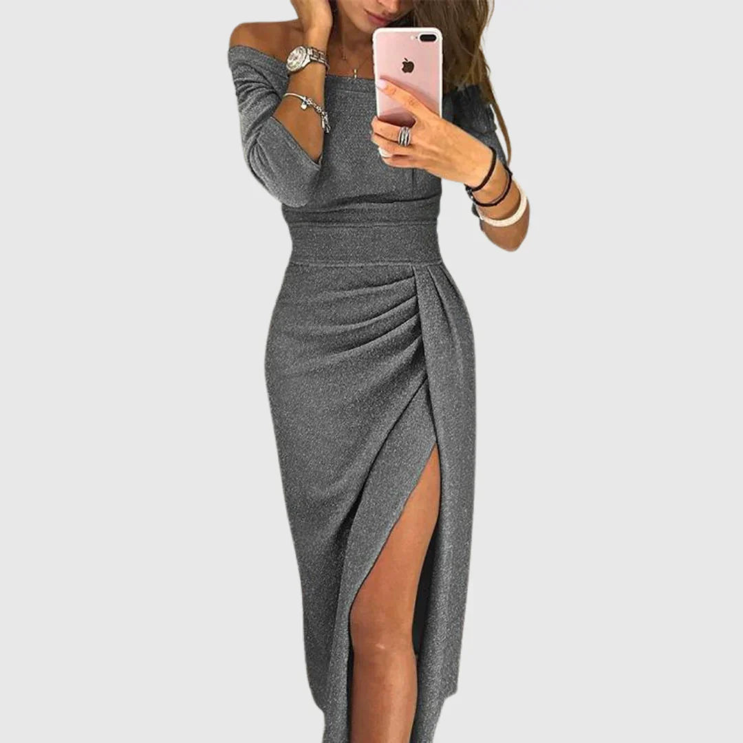 Cechy: Odsłonięte ramiona, dopasowany krój, drapowanie, spektakularne rozcięcie