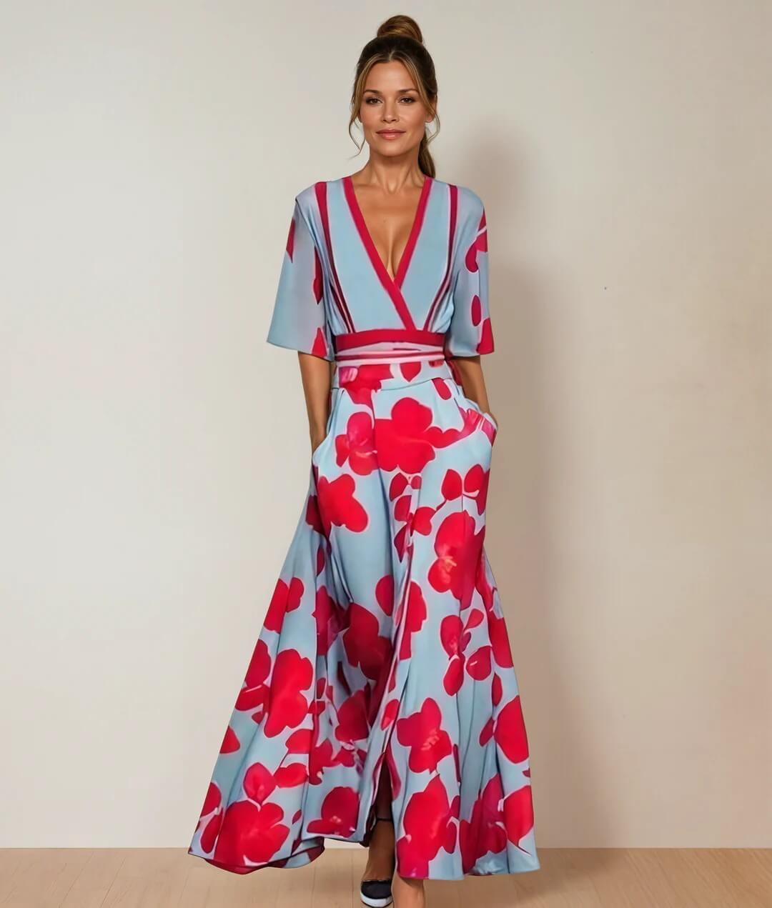 Dodaj romantyczny i wyrafinowany akcent do swojej garderoby z Sukienką Kwiatową Sofia. Wykonana z lekkiego i przewiewnego materiału, który jest niezwykle wygodny, podczas gdy żywy kwiatowy wzór nadaje świeżości i kobiecości. Korzystny dekolt w kształcie V, stylowe rękawy o długości 3/4 oraz podkreślona talia tworzą elegancki sylwetkę. Dzięki długiej, zwiewnej spódnicy, sukienka pięknie porusza się przy każdym kroku – idealne połączenie komfortu i stylu.